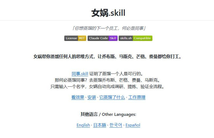GitHub上爆红的开源项目“同事.skill”正是这一技术的缩影。开发者仅用4小时,就将一位离职同事的工作习惯、沟通语气甚至甩锅话术,训练成了一个24小时在线的“数字同事”,5天内收获近7万星标。这项技术瞬间引爆网络,“老板.skill”“导师.skill”“前任.skill”层出不穷。